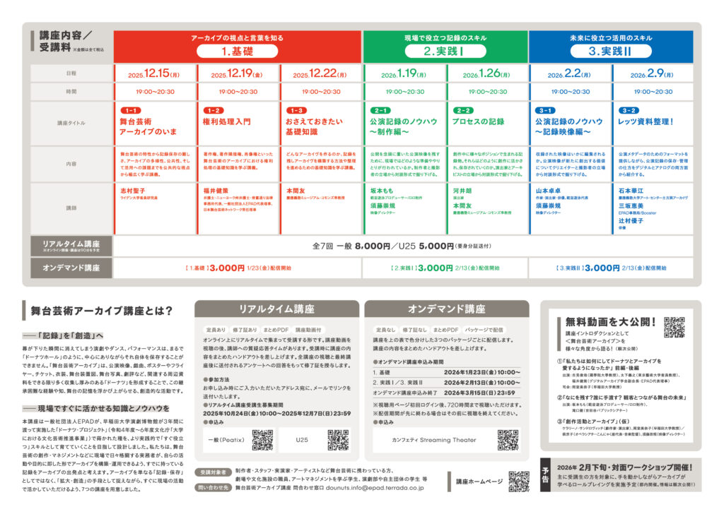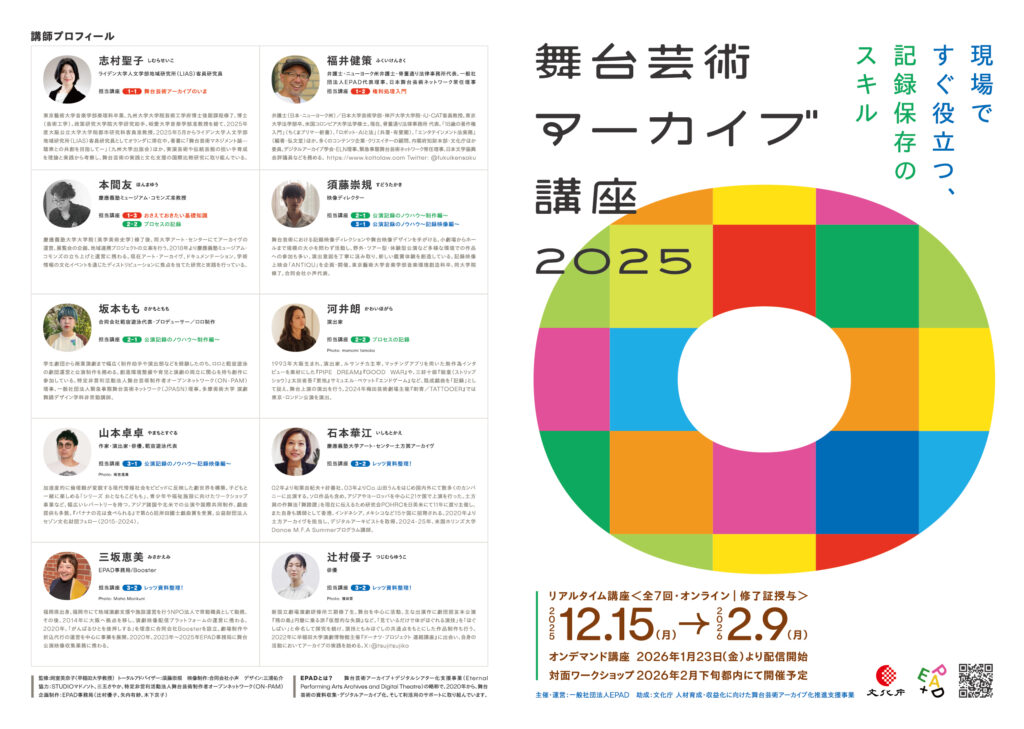 一般社団法人EPADは、2025年12月より「舞台芸術アーカイブ講座2025~現場ですぐ役立つ、記録保存のスキル~」を開講します。本講座は、舞台芸術の創作やマネジメントに日々携わる実務者が、自身の活動や目的に合わせた形でアーカイブを構築し、運用できるようにすることを目指して設計されています。