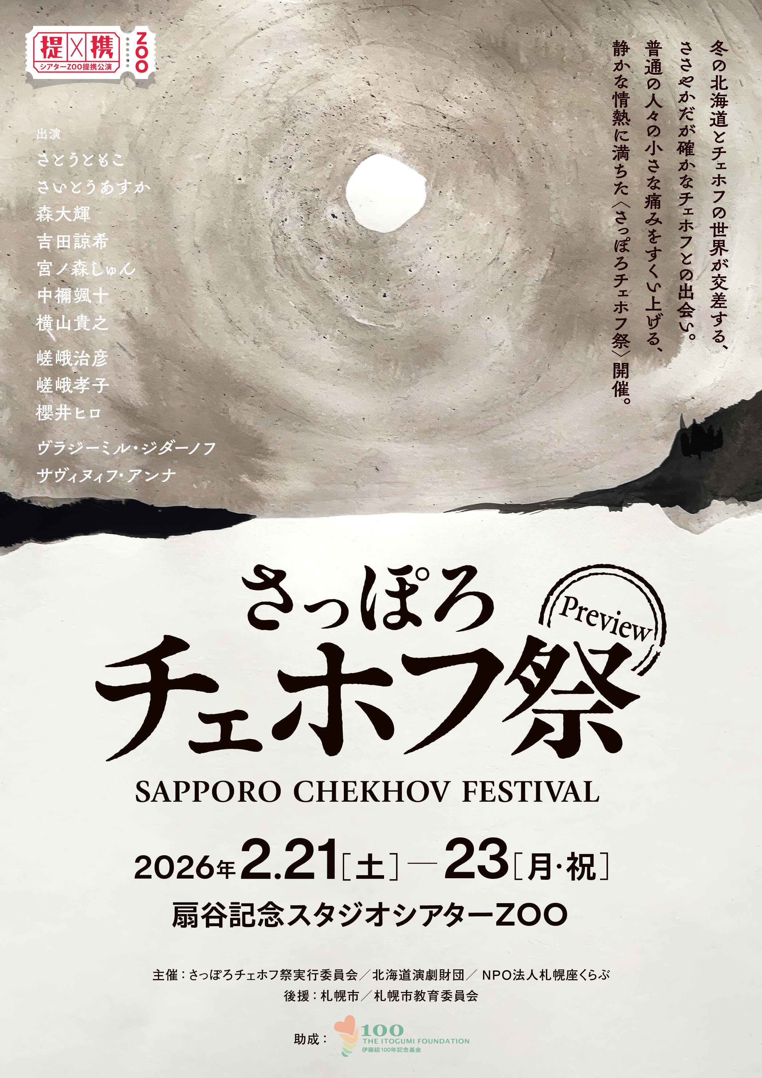 北の大地の厳しい寒さの中で、人々の営みの温かさや可笑しさ、愛おしさを描くチェホフの世界が、2月の札幌と静かに共鳴します。笑って、少し切なくて、心の奥に余韻が残る――そんなひとときを冬のシアターZOOでお楽しみください。