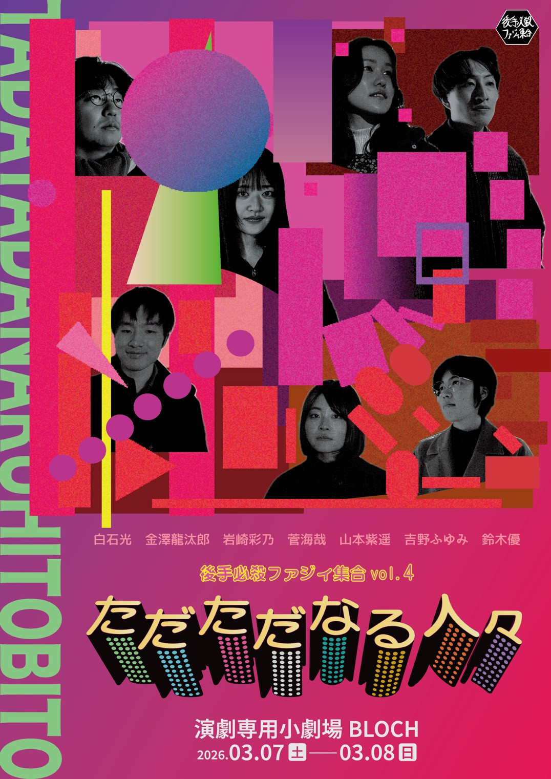 2026-03-07後手必殺ファジィ集合vol.4『ただただなる人々』後手必殺ファジィ集合vol.4『ただただなる人々』3月7日 - 3月8日後手必殺ファジィ集合vol.4『ただただなる人々』目の回るような今を生きる、全ての人々に! 後手必殺ファジィ集合の第4回公演は、札幌で活躍する同世代の仲間とともに描くSNS群像劇。 人と繋がった先に何があるのか?私たちは何を信じて生きていけばいいのか? 今を生きる全ての ...
